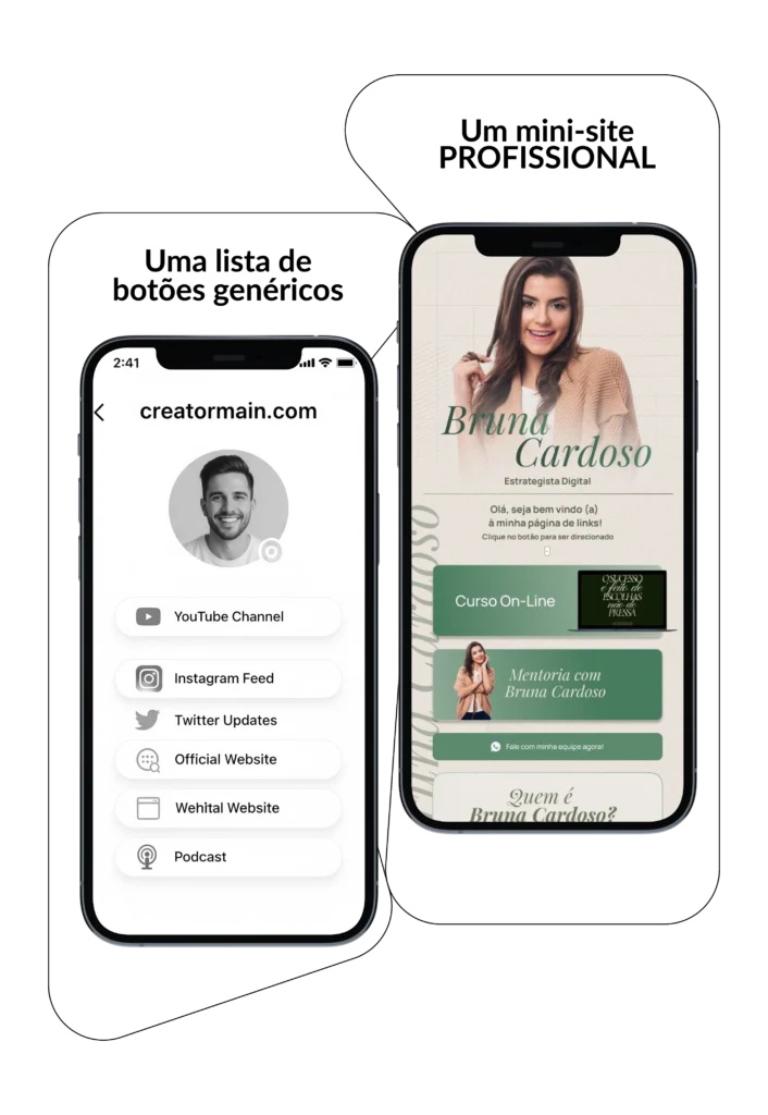 Não é um template genérico. Nós criamos um site profissional e exclusivo para o seu link da bio, com design personalizado e pronto para a sua marca. Ele funciona para te ajudar nas vendas, com domínio próprio, que eleva a credibilidade e transforma visitantes em clientes.